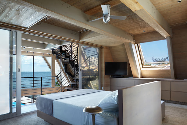 Thiết kế phòng ngủ có gác lửng kiểu phá cách sẽ đem đến cho bạn một cảm giác mới mẻ chưa từng có, như đang ở trên một khoang tàu nào đó và thực hiện chuyến du ngoạn trên biển. Gam màu trắng chủ đạo mang lại cảm giác sạch sẽ và không gian phòng ốc được thông thoáng, rộng rãi hơn.